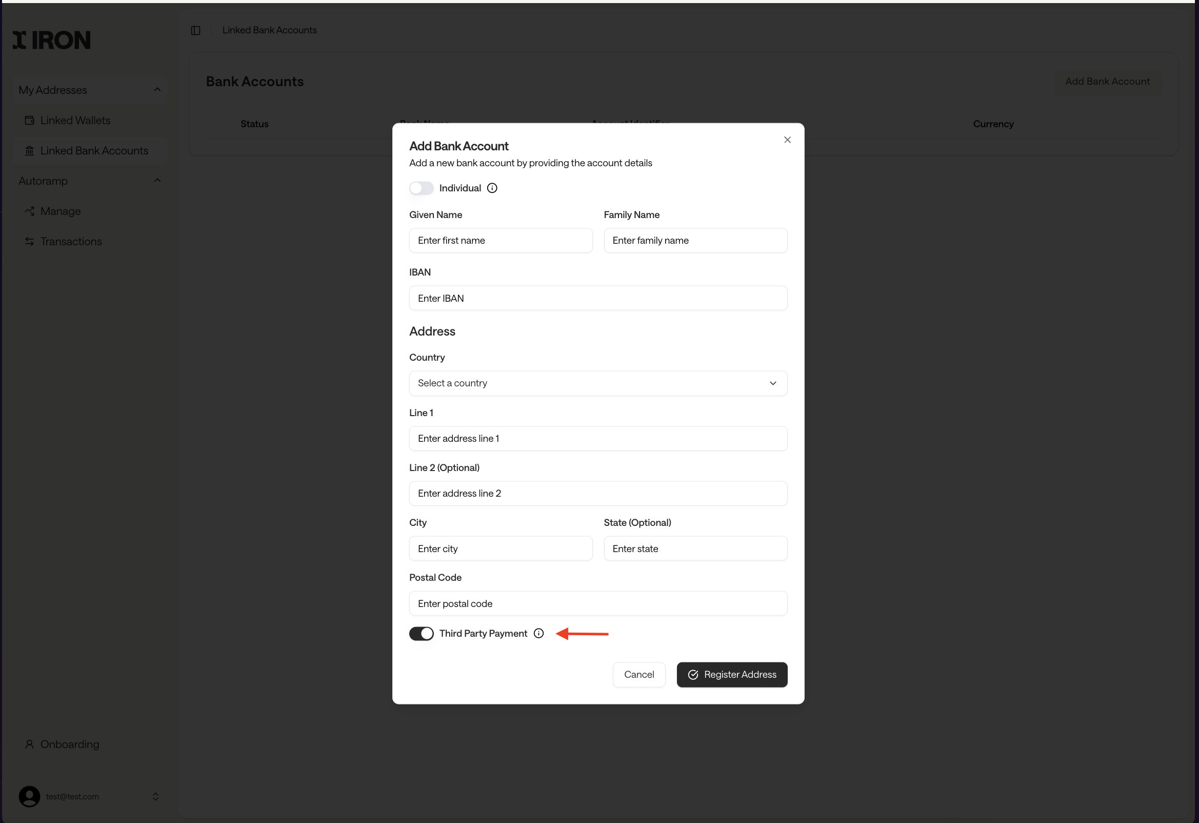 Iron enables the creation of Autoramp configurations that enable third party payment:- Onramp: Accept fiat payments from external bank accounts as a third-party source.